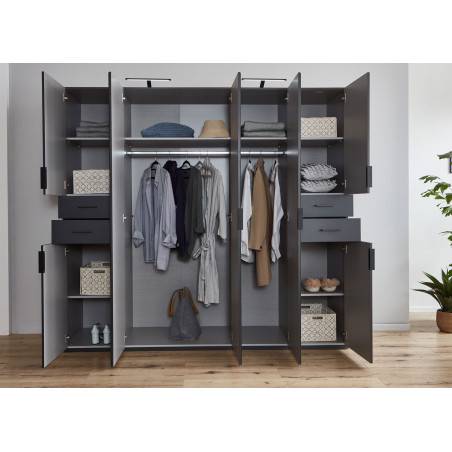 Cette grande armoire de 225 cm est conçue pour répondre à vos besoins de rangement. Elle est équipée de deux espaces de penderies, de quatre tiroirs pratiques qui offrent un espace supplémentaire pour ranger vos accessoires. Son design et ses finitions de haute qualité en font un choix idéal pour ceux qui recherchent une solution de rangement pratique et esthétique à leur maison.