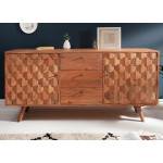 Buffet en bois d'Acacia clair avec effets Marquetés. Un magnifique meuble en Bois massif disposant d'élégants motifs géométriques sculptés en relief et d'un piétement en bois qui évoque le style Scandinave. Un Buffet en bois Massif original et atypique qui s'agencera dans une pièce Moderne comme un Salon ou une Salle à Manger avec des meubles de la même collection.
