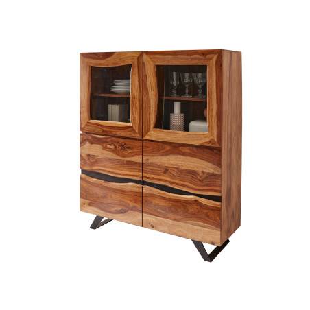 Un superbe Buffet haut en bois massif mariant le style naturel et industriel à la perfection. 2 Portes vitrées pour mettre en avant votre décoration et 2 portes en bois pour cacher vos nappes et vos accessoires de cuisine.