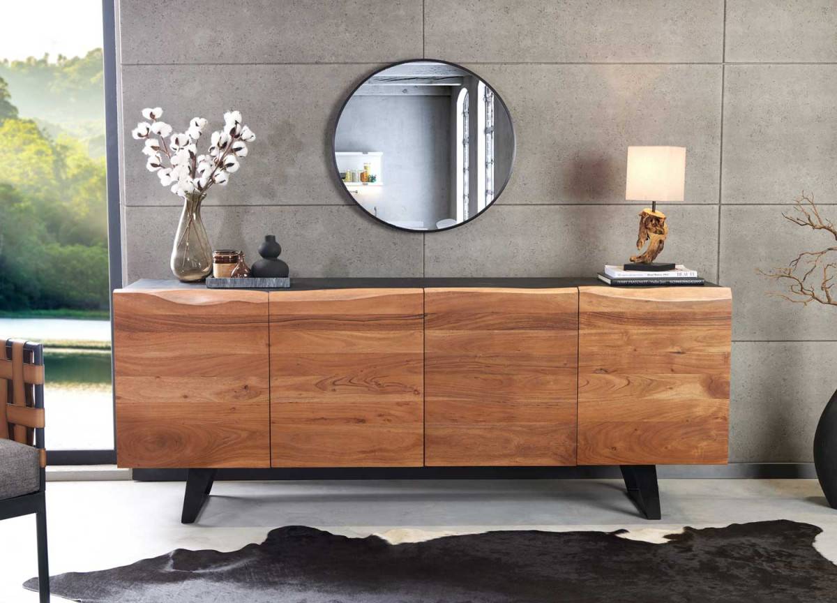 Ce Buffet est un meuble élégant et fonctionnel mesurant 180 cm. Sa structure est fabriquée en MDF anthracite. Les 4 portes du buffet sont réalisées en bois massif d'acacia, ce qui confère une belle finition naturelle et chaleureuse. Le buffet offre 4 grands compartiments de rangement. Les pieds en métal anthracite ajoutent une touche moderne et contemporaine à l'ensemble du meuble.