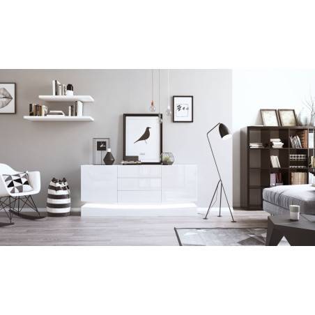 Un Buffet Design quel que soit la couleur choisie, un meuble de salon, séjour suspendu et lumineux avec éclairage LED télécommandé. Un meuble buffet suspendu produit en 9 coloris différents laqués ou structurés et composé de trois tiroirs et deux portes.
