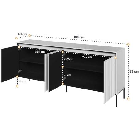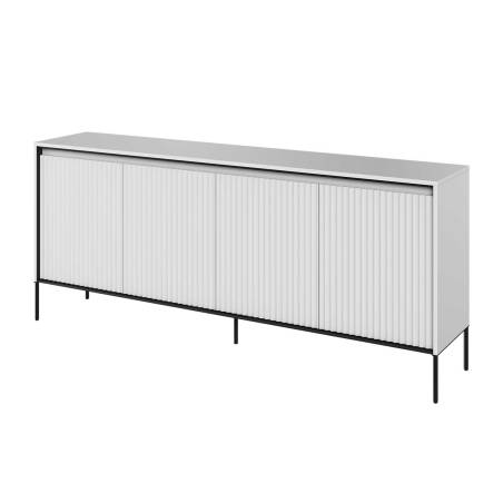 Ce buffet blanc au design raffiné et épuré est un mariage harmonieux de minimalisme et d'élégance moderne. Ses façades texturées en relief apportent une touche de dynamisme, tandis que son bandeau LED subtilement intégré diffuse une lumière douce et chaleureuse, soulignant son allure contemporaine. Doté de quatre portes spacieuses, il offre une solution de rangement pratique, idéale pour un salon ou une salle à manger. Sa structure fine et ses pieds noir métallique confèrent à l'ensemble une légèreté visuelle.