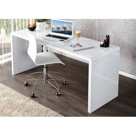 Un bureau blanc laqué brillant pour dessiner, étudier, travailler, écrire, un meuble de salon ou de chambre simple sans artifice. Ce bureau possède un plan de travail de 120 cm ainsi qu'une profondeur de 60 cm, les bords de ce bureau sont arrondis et il est équipé d'une jupe arrière, idéale si celui-ci n'est pas tourné contre un mur.