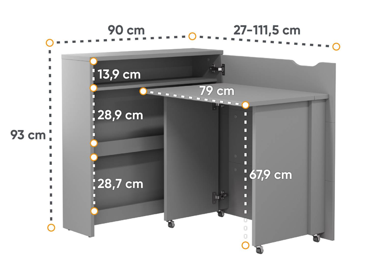 Ce Bureau Lenart blanc alpin pliant de 115 cm est à la fois compact et fonctionnel, avec un plateau rabattable pour optimiser l’espace, des étagères intégrées pour le rangement et des roulettes discrètes qui facilitent son déplacement et son utilisation au quotidien.