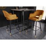 Lot de 2 Tabourets de bar design capitonnés revêtus d'un Velours matelassé coloris Jaune moutarde. Pour un confort optimal, ces tabourets haut de bar sont équipés d'une coque enveloppante avec accoudoirs pour se détendre et de 4 pieds à pointes dorées avec repose-pieds pour un relâchement total. Pour décompresser et se distraire autour d'un verre entre amis, ces tabourets de bar confortables sont parfaits.