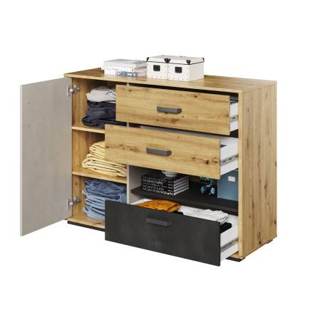 Au cœur de l'espace vibrant d'une chambre adolescente, la Commode devient une œuvre d'art fonctionnelle. Parée d'une fusion de teintes chêne, gris graphite et gris clair, elle incarne une élégance contemporaine, apportant une touche raffinée à l'environnement. La porte unique, discrètement intégrée, cache un espace mystérieux, tandis que les trois tiroirs offrent une organisation ingénieuse pour les trésors personnels. Chaque poignée devient une invitation à explorer, révélant l'harmonie entre la forme et la fonction.