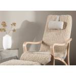 Le fauteuil présente un style scandinave minimaliste avec une structure en contreplaqué clair. Il est recouvert d'un tissu bouclé beige, qui lui donne un aspect chaleureux et confortable. Le fauteuil est accompagné d'un repose-pieds assorti, également en bois et tissu bouclé, ce qui accentue l'aspect cocooning. Un coussin de tête en tissu, plus lisse, est attaché à l'appuie-tête pour plus de confort. Ce design bi-matière, combinant bois naturel et tissu texturé, reflète parfaitement l'esthétique scandinave, qui mise sur la simplicité et le confort.
