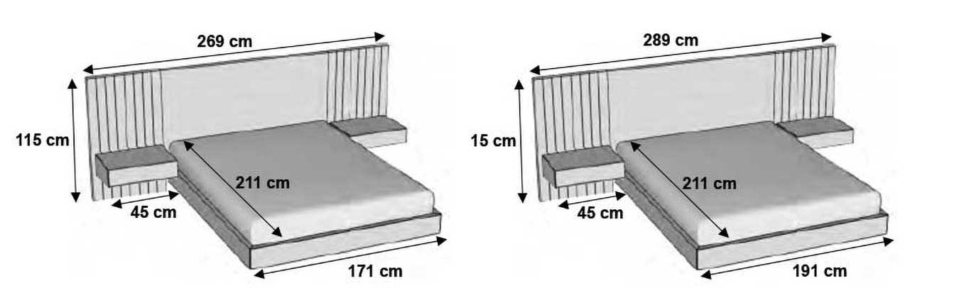 - 2 Chevets suspendus de 1 tiroir, poignées intégrées sur le côté, débord sur le dessus (La fixation des chevets suspendus nécessite un perçage à réaliser vous-même.)