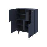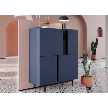 Cette Commode Haute à quatre portes est une pièce unique et originale. Avec son style moderne et ses jambes élancées, elle est robuste et légère à la fois. La teinte de bleu foncé aux accents noirs est très attractive, complétée par des poignées dorées et des bords fraisés. L'intérieur offre des étagères spacieuses et profondes pour divers accessoires. Le dessus peut être utilisé pour afficher des décorations ou des objets de valeur. Elle est dotée d'un système de fermeture en douceur pour une ouverture et une fermeture sans effort.
