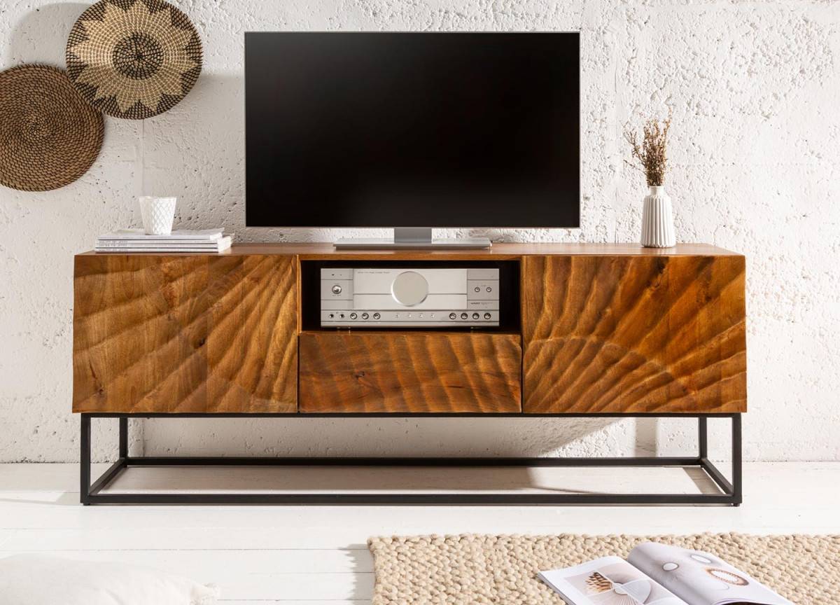 Un Meuble TV en bois massif qui s'exposera comme une sculpture, un objet d'art, un meuble de salon équipé de 2 portes et 1 tiroir sculptés 3D reposant sur un socle en métal noir. On choisit un intérieur unique en achetant ce meuble TV design. Commandez en ligne et bénéficiez d'une Livraison Gratuite pour profiter d'un meuble TV exceptionnel.