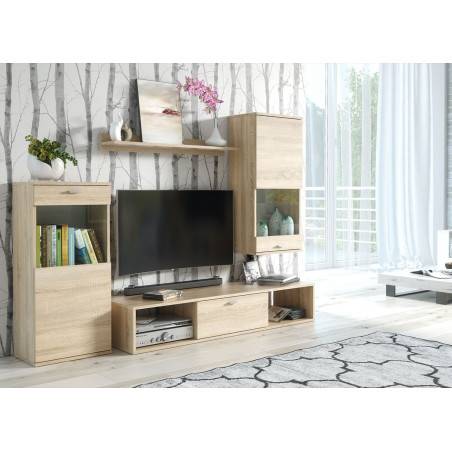 Un ensemble de meuble moderne pas cher pour coin TV composé de 4 meubles. Idéalement conçu pour les petits budgets sans se détourner de ses fonctions, cet ensemble de meuble TV décor chêne "Sonoma" dispose de beaucoup de rangement pour tout appareil qui nous lie à la télé. La possibilité d'arranger les meubles à votre façon ou de les disposer comme présenté vous laisse libre dans l'aménagement de votre coin TV.