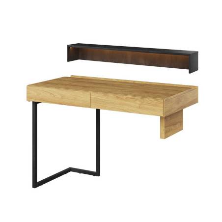 Bureau finition chêne : 1 Table de travail, 2 tiroirs, fond ouvert pour le passage des câbles, rehausse, finition intérieur chêne