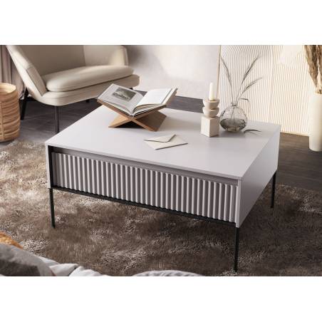 Cette Table Basse Rectangulaire blanche s'intégrera facilement dans n'importe quel salon moderne. Son design épuré est mis en valeur par un piètement en métal noir et une porte battante striée. Cette dernière dissimule un espace de rangement pratique pour maintenir l'ordre dans votre intérieur.