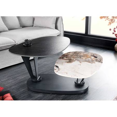 Transformez votre salon avec cette Table Basse en céramique, dotée de deux plateaux rotatifs noir et aspect pierre naturelle, elle est extensible jusqu'à 160 cm.