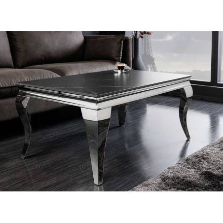 Retrouvez-vite cette Table Basse en céramique aspect marbre noir équipée de quatre pieds chromés de style baroque chez vous ! Une table basse design de 100 cm de long sur 60 cm de profondeur qui entraînera votre salon dans un univers chic et contemporain. Cette table basse rectangulaire s'agencera dans un salon proche d'un beau canapé.