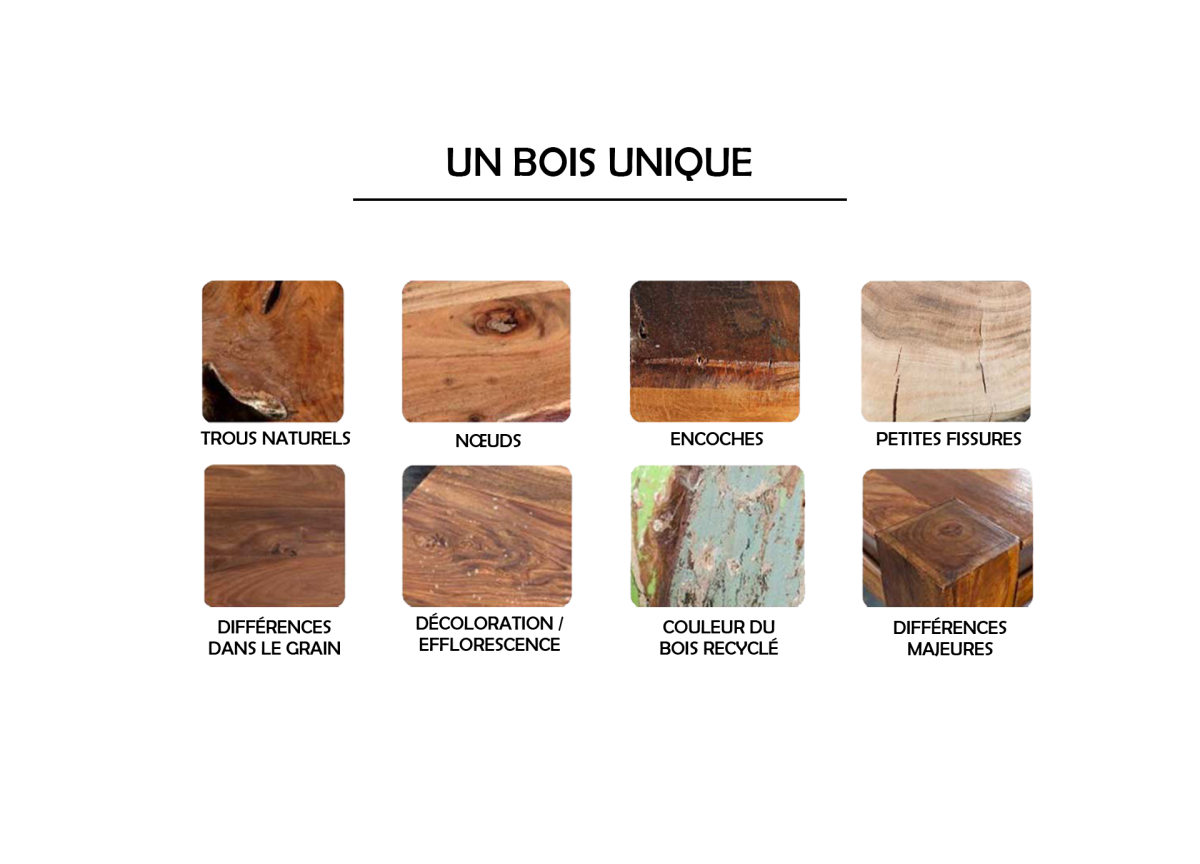 Remarque : puisqu'il s'agit d'un produit naturel, chaque copie est absolument unique. Des irrégularités, des nœuds charismatiques, des fissures ou même des différences dimensionnelles sont possibles et créent de l'originalité qui fait le charme d'un meuble en bois massif. Les variations de couleurs, les ecchymoses naturelles sont intentionnelles et ont pour but l'authenticité d'un meuble en bois massif. Aucun de ces éléments ne constitue un motif de plainte.