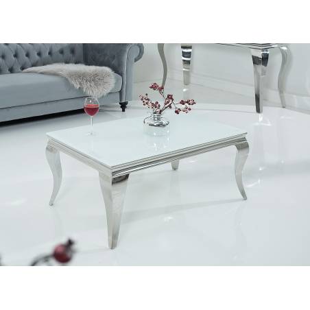 Retrouvez-vite cette Table Basse en verre opale blanc et pieds en métal chromé de style baroque chez vous ! Une table basse design de 100 cm de long sur 60 cm de profondeur qui entraînera votre salon dans un univers chic et contemporain. Cette table basse blanche et chrome rectangulaire s'agencera dans un salon proche d'un beau canapé.
