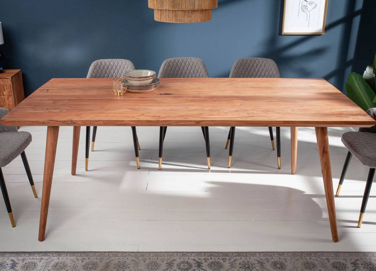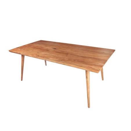 Table à Manger rectangulaire en bois d'Acacia teinté marron à effets lattés. Une magnifique table à manger en bois massif disposant d'atout de qualité comme son plateau de 2 cm d'épaisseur biseauté et raboté et de ses pieds coniques évoquant le style Scandinave. Une Table à Manger 6/8 personnes en bois design qui s'agencera dans une salle à manger Moderne avec des meubles de la même collection.