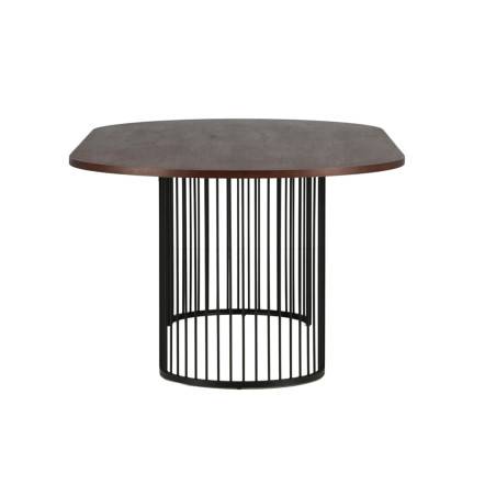Cette élégante table à manger de la collection Hamneskar possède un plateau ovale en bois foncé et une base décorative en acier noir étroit en forme de deux demi-cercles.
