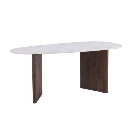 Une Table à manger qui évoque l'élégance naturelle et la modernité subtile. Avec ses 180 cm et sa forme elliptique unique, elle devient le point central d'une salle à manger contemporaine. Son plateau en imitation pierre gris clair ajoute une touche de raffinement, évoquant l'esthétique intemporelle de la pierre naturelle. Les pieds au fini bois moka offrent un contraste chaleureux, fusionnant harmonieusement la modernité et le naturel dans un design épuré et captivant.